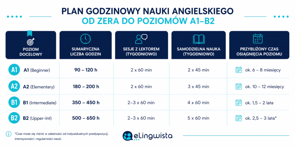 Ważne: Powyższy harmonogram jest elastyczny. Jeśli wybierzesz intensywny kurs angielskiego online, możesz skrócić te widełki, zwiększając liczbę godzin pracy własnej przy wsparciu naszych dedykowanych materiałów premium.