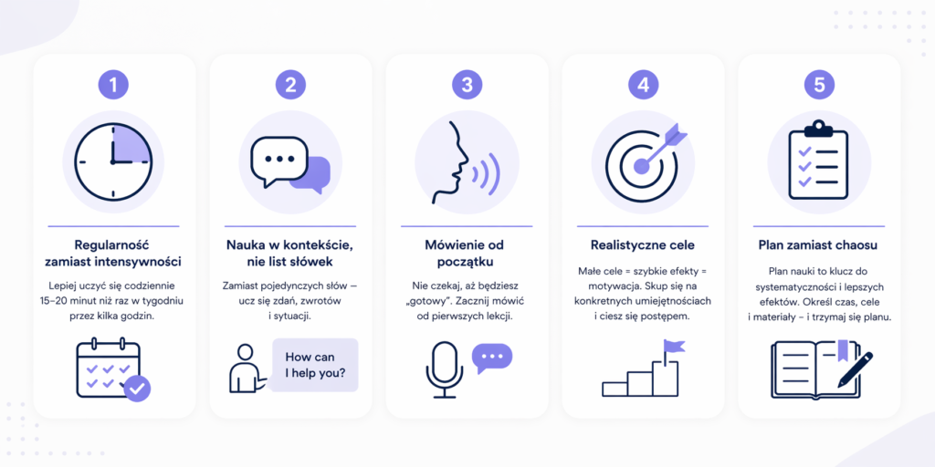 Lepiej uczyć się codziennie 15–20 minut niż raz w tygodniu przez kilka godzin. Jeśli zastanawiasz się, czy to w ogóle ma sens, polecamy ci zapoznać się z tym artykułem.